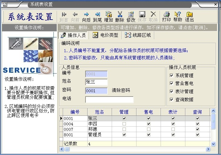 系統(tǒng)默認(rèn)的管理人員有“張三、李四、德邦、管理員”。 其中“管理員”是最高權(quán)限擁有者,不能刪除。其它人員能夠隨意刪除增加。